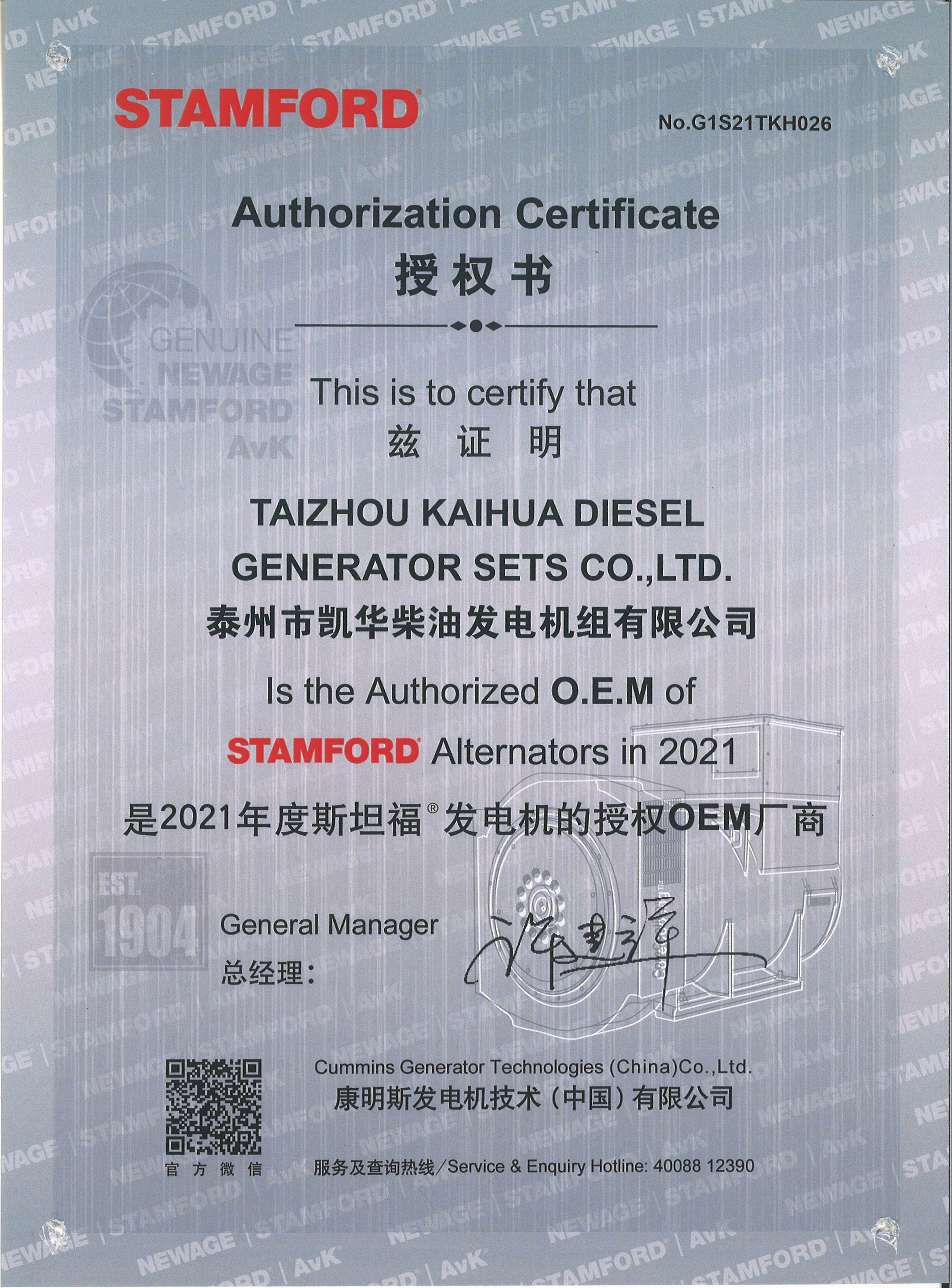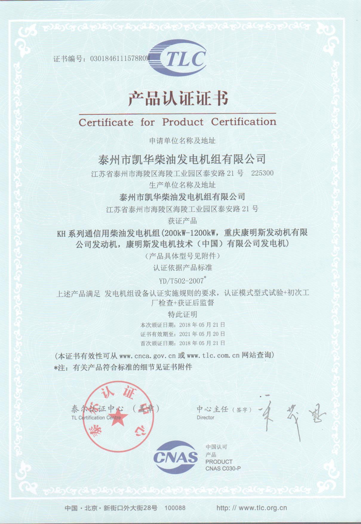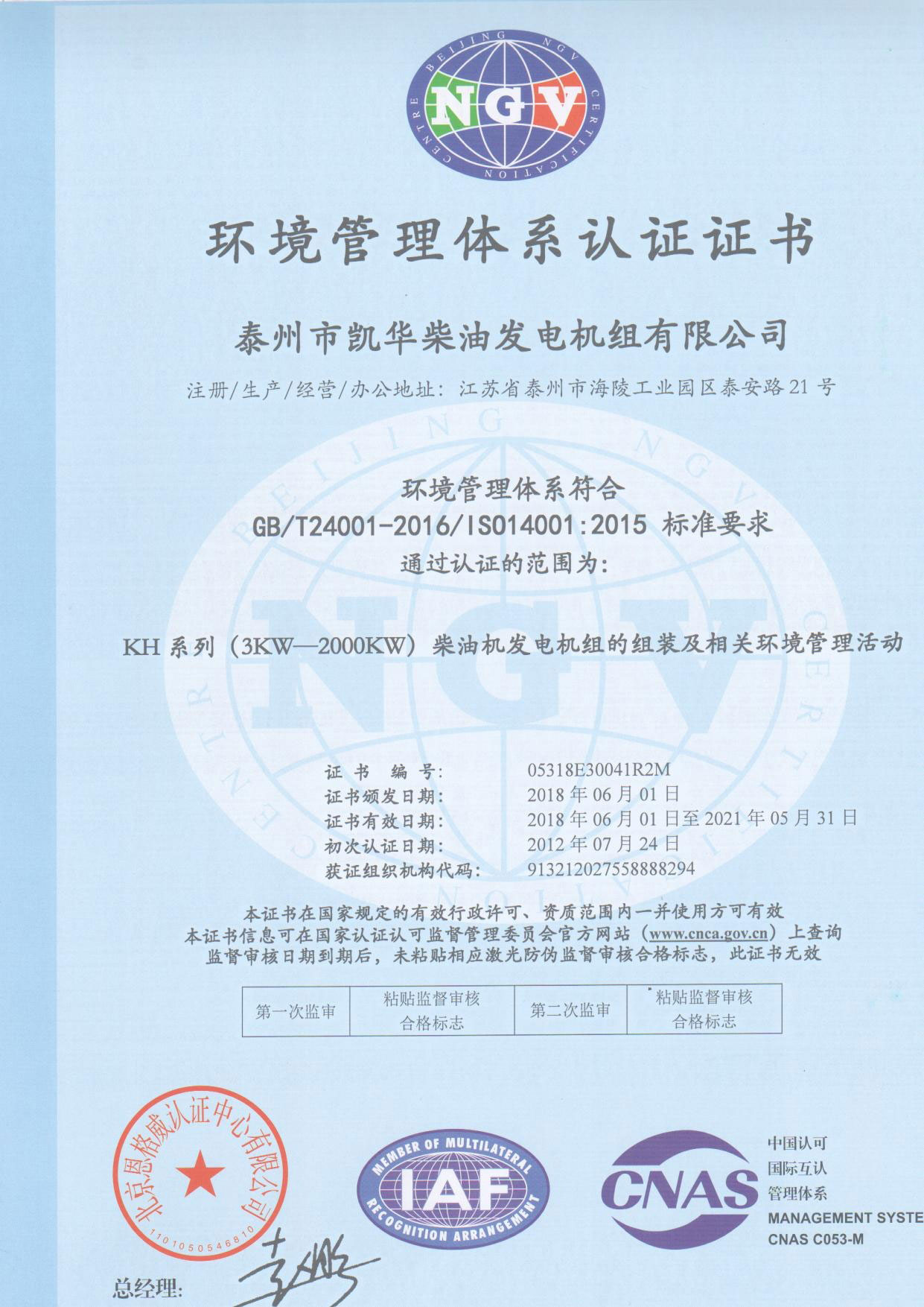 發(fā)電機組廠家凱華公司已先后通過ISO9001質(zhì)量認證、泰爾認證、ISO14001-2001環(huán)境管理體系認證、GB/T28001-2001職業(yè)健康安全管理體系認證,歐盟CE認證、SGS認證等。