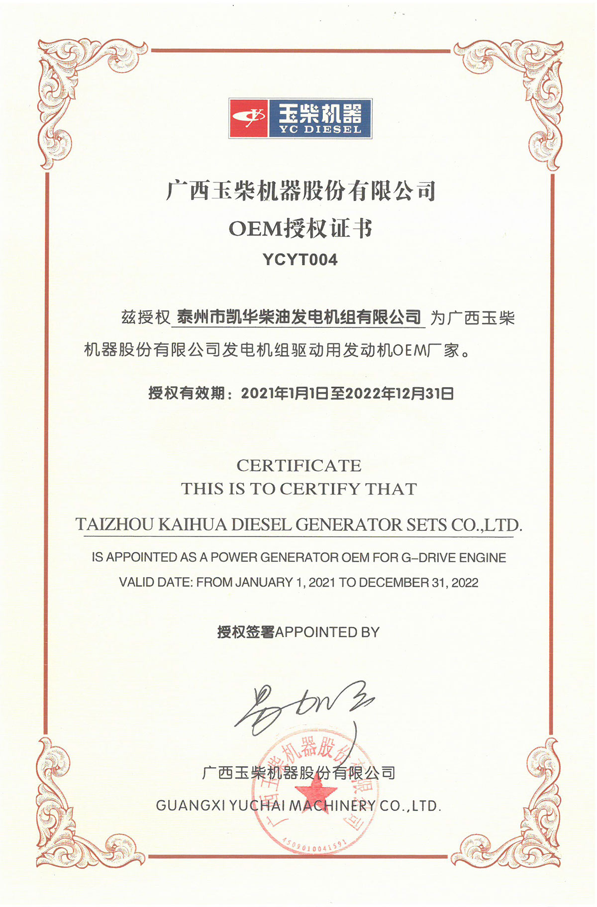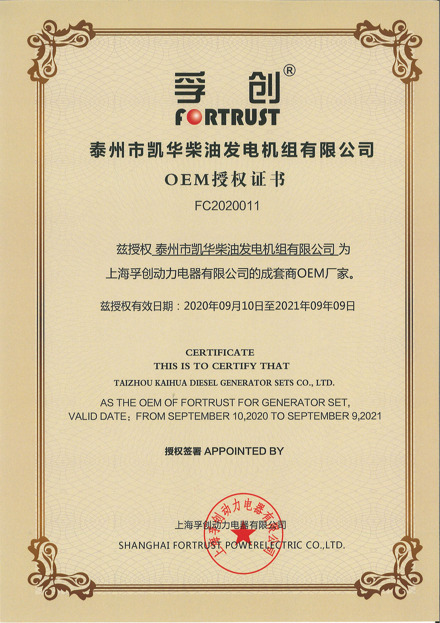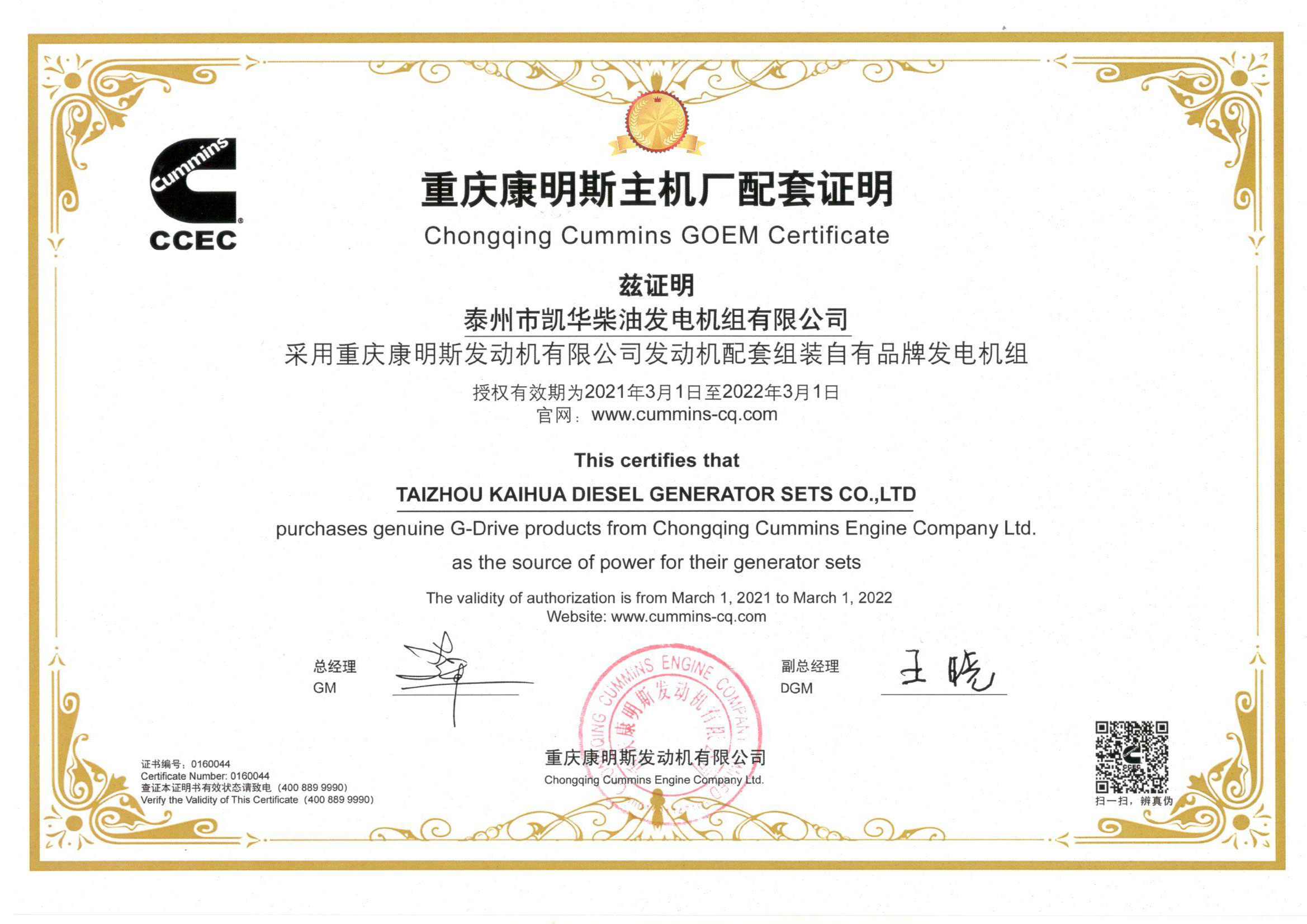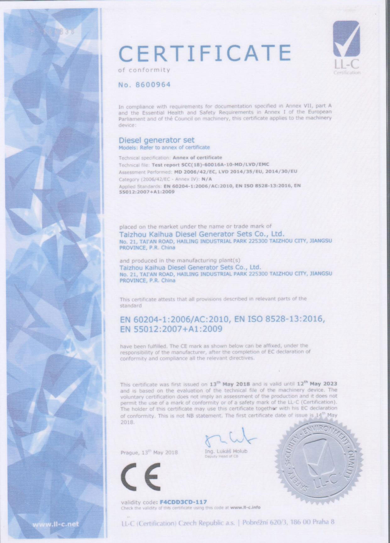 發(fā)電機組廠家凱華公司已先后通過ISO9001質(zhì)量認證、泰爾認證、ISO14001-2001環(huán)境管理體系認證、GB/T28001-2001職業(yè)健康安全管理體系認證,歐盟CE認證、SGS認證等。