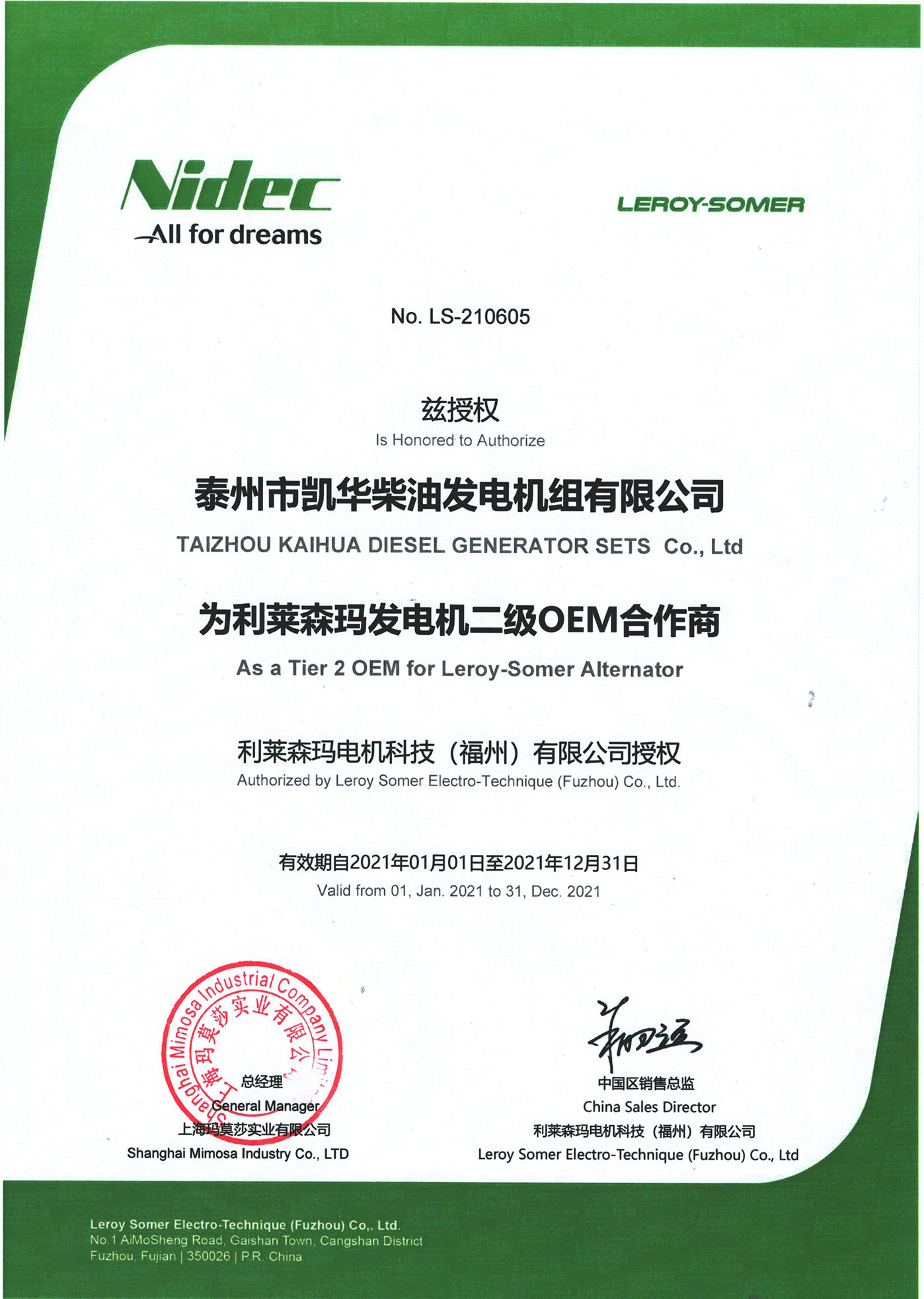 泰州市凱華柴油發(fā)電機組有限公司創(chuàng)建于2003年,是一家集柴油發(fā)電機組的研發(fā)、生產(chǎn)、銷售為一體的高新技術民營企業(yè),公司目前注冊資本金11800萬元人民幣,生產(chǎn)基地占地六十畝,現(xiàn)有各類高素質(zhì)員工一百多名,專業(yè)技術人員達46人,其中高級技術人員16人,年銷售額近6億元。公司主營產(chǎn)品:3~3000KW陸用柴油發(fā)電機組,15~600KW移動拖車電站,12~1000KW船用應急柴油發(fā)電機組,各種靜音型、中高壓、多機并聯(lián)、燃氣等特種機組以及進口系列柴油發(fā)電機組,可滿足不同客戶的不同電力需求,還可滿足用戶不同電壓、不同頻率的要求。